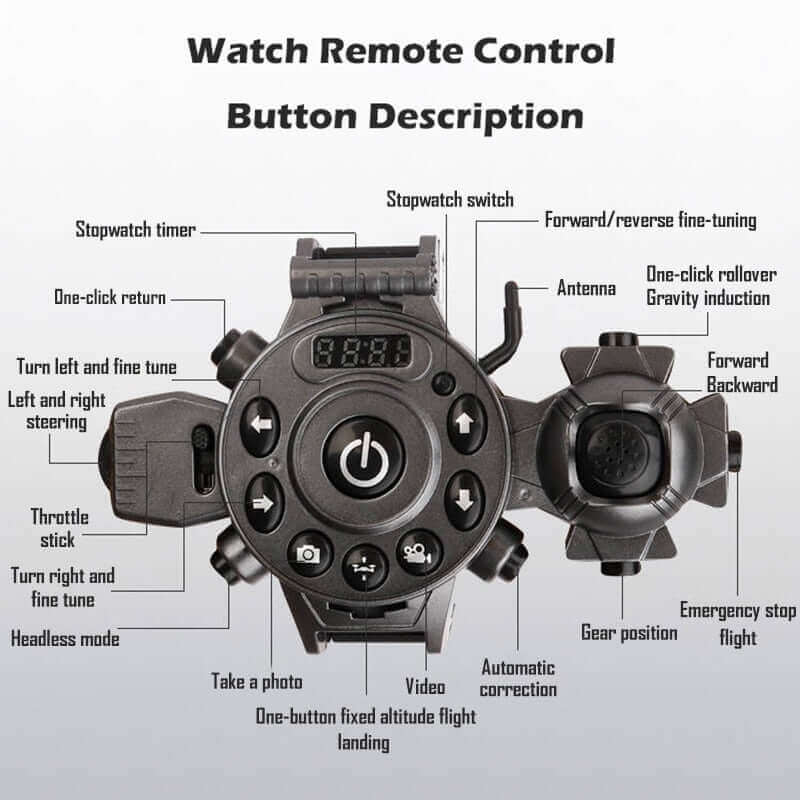 - Includes: Drone, batteries, remote controller (watch model design), camera, USB cable, and instructions